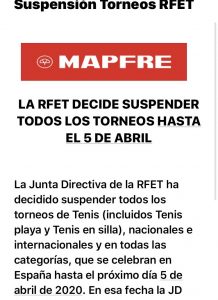 12/03/2020. Siguiendo las directrices de la Real Federación Española de Tenis se suspenden todas las eliminatorias del Campeonato de Veteranos.